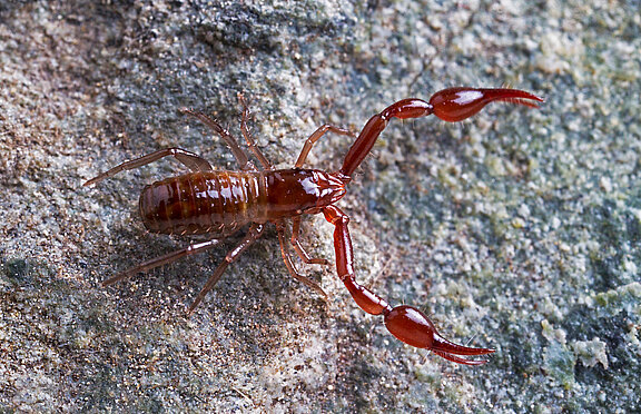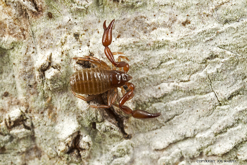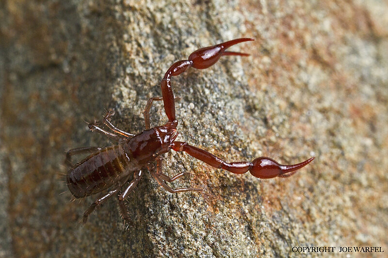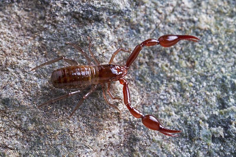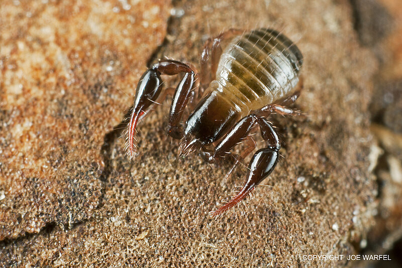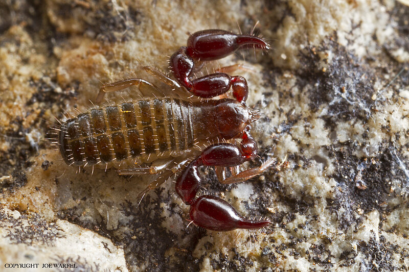 Pseudoscorpions, occasionally known as false scorpions or book scorpions, are arachnids belonging to the order Pseudoscorpiones, sometimes known as Pseudoscorpionida or Chelonethida. Pseudoscorpions occur in all terrestrial environments from the seashore to the world’s highest peaks. They are generally rather small, with the largest reaching a body length of 1 cm. All are predators feeding on other arthropods such as springtails, flies, beetles and mites. Members of the suborder Iocheirata have venom glands in the chelal fingers (the ‘pincers’) that discharge venom via the finger tip, enabling them to subdue and kill their prey.