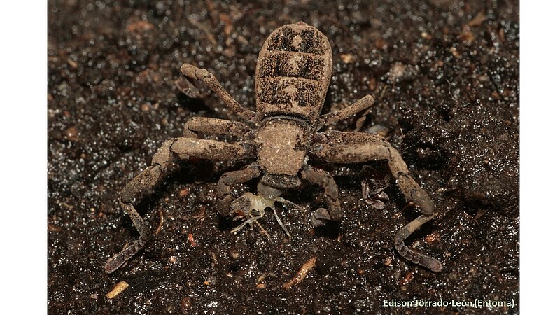 Ricinuleids have a locking mechanism between the prosoma (head region) and opisthosoma (2nd body part) that can be unhooked curing mating and egg laying. The 3rd leg of the male is specialized for sperm transfer. Ricinuleids have six-legged nymphs (1st post-egg larval stage), similar to Acarina. They can live 5 – 10 years.
